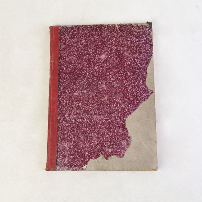 Libro de forma rectangular y de gran grosor, con tapas rígidas forradas con patrones de puntos en rojo y negro y un lomo ancho. En su interior contiene hojas con recortes de prensa.