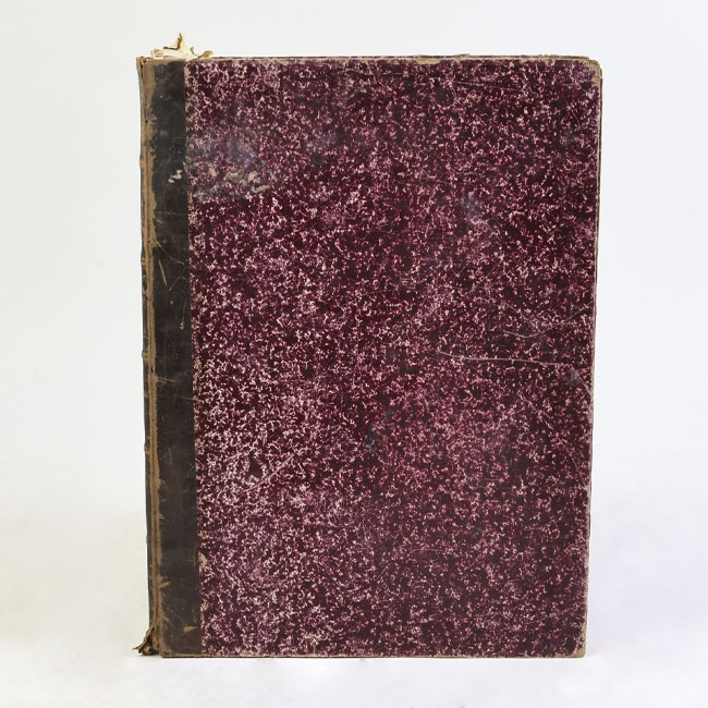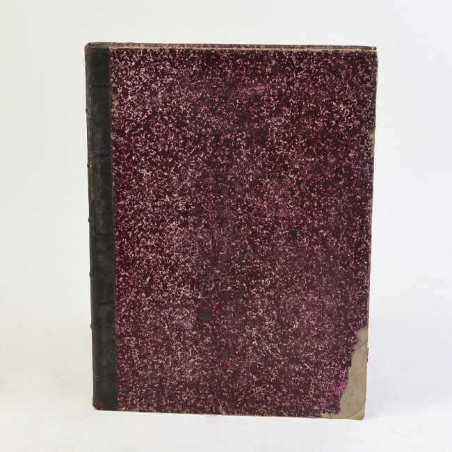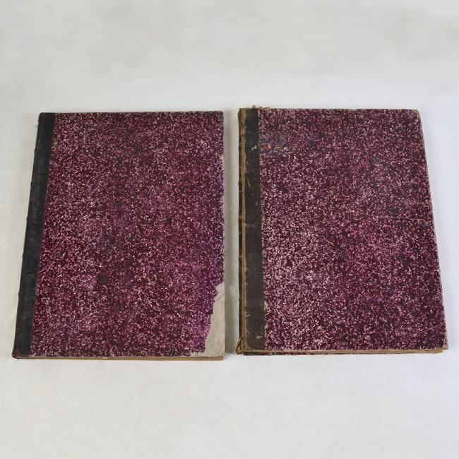 Conjunto de dos libros de forma rectangular y de gran grosor, con tapas rígidas forradas con patrones de puntos y un lomo ancho. En su interior contiene hojas con recortes de prensa.
