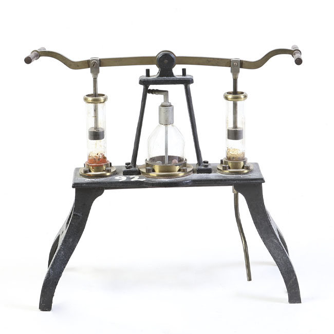 Dispositivo de estructura metálica con base rectangular y dos patas curvas. Presenta un cuerpo central con un recipiente de vidrio sostenido por anillos metálicos. A cada lado hay cilindros de vidrio con émbolos y tapas de corcho, conectados mediante varillas metálicas. En la parte superior destacan dos manivelas simétricas, curvas y alargadas. Los componentes combinan metal oscuro, bronce y vidrio transparente.
