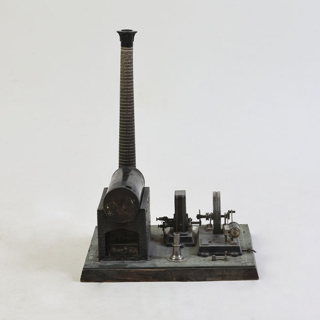 Modelo de motor de vapor con base de madera, estructura metálica, cilindro, pistón y conexiones para transmitir movimiento. Componentes detallados de funcionamiento mecánico.