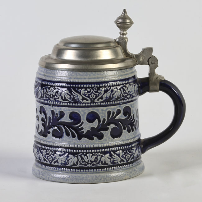 Jarra de cerveza, de cuerpo cilíndrico, de cerámica esmaltada en tonos azul y gris, con decoración en relieve de motivos vegetales, asa lateral y tapa metálica articulada.