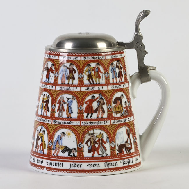 Jarra de cerveza de cerámica esmaltada, cuerpo troncocónico, decoración policroma con escenas figurativas en franjas, inscripciones, asa lateral y tapa metálica articulada.