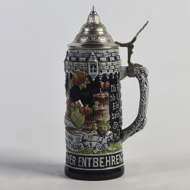 Jarra de cervecera de cerámica esmaltada y policromada, de cuerpo cilíndrico con escenas figurativas en relieve y textos en alemán. Asa lateral decorada y tapa metálica abatible.