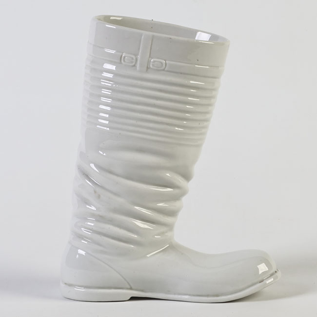 Jarra cervecera de cerámica esmaltada blanca, con forma de bota alta. Presenta relieve de pliegues en el cuerpo, borde circular y base plana integrada en una sola pieza.