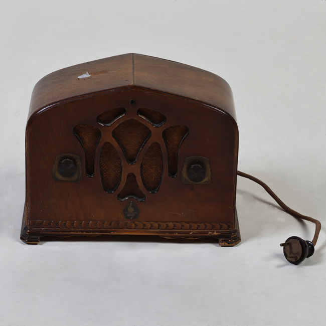 Aparato eléctrico destinado a la recepción de señales radiofónicas y su reproducción sonora mediante altavoz integrado. De cuerpo de madera, en forma de arco, con cable y enchufe integrado.