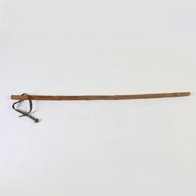 Instrumento tradicional utilizado para conducción de ganado y control de animales. Rebenque de madera, largo y delgado, con una cuerda atada en un extremo que funciona como tomador o asa. Superficie lisa, sin adornos visibles.