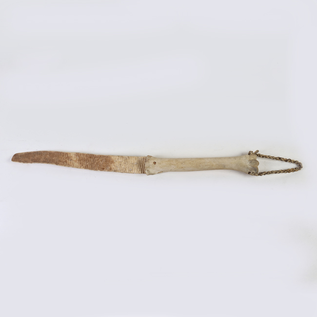 Rebenque elaborado en hueso, alargado y cilíndrico, con un tomador de cuerda atado a un extremo. Superficie pulida y uniforme, sin decoración aparente.