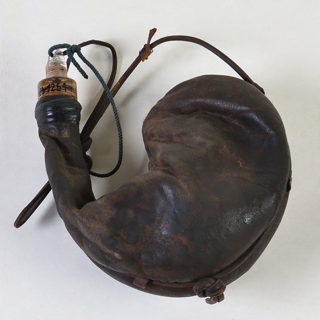 Contenedor portátil para almacenar y beber vino, recipiente de cuero flexible, de forma ovoide con cuello estrecho y boquilla para beber. Posee un tomador de cuerda en un extremo. Superficie lisa.
