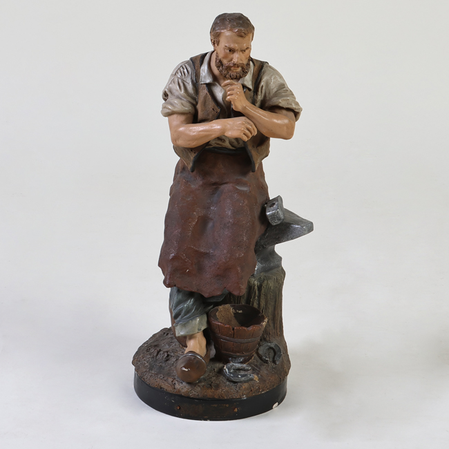 Figura antropomorfa masculina de bulto redondo, representada de pie, con brazos cruzados sobre el pecho. Viste túnica corta en tonos ocres y verdosos. Policromía parcial. Base circular oscura.