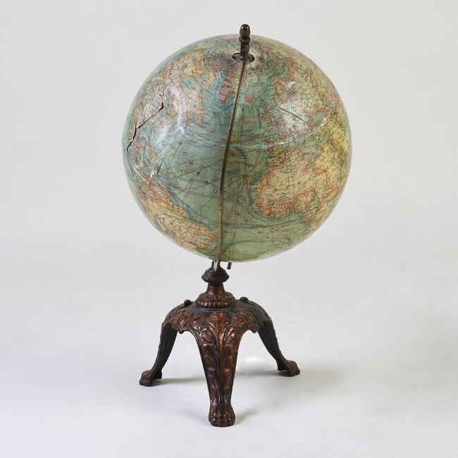 Globo terráqueo esférico, con representación cartográfica impresa en su superficie. Se encuentra montado sobre una base de soporte compuesta por tres patas, que le otorgan estabilidad.
