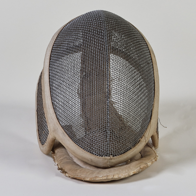 Máscara de esgrima con careta frontal de malla metálica plateada, contorno acolchado y babero textil extendido, que cubre cabeza, rostro y cuello del usuario.