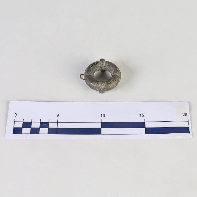 Objeto decorativo con forma de salvavidas, de dimensiones reducidas. Presenta una morfología circular con orificio central, evocando el diseño de un salvavidas tradicional.