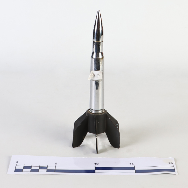 Objeto tridimensional correspondiente a un encendedor con diseño figurativo en forma de cohete. Presenta base de color negro, que sirve de soporte. El cuerpo principal es alargado y de color plateado, evocando la morfología de un cohete espacial.