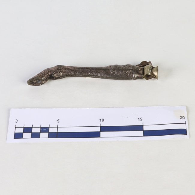 Objeto compuesto por un mango alargado tallado en forma de pata de animal, con representación esquemática del extremo distal que sugiere la pezuña o garra, y superficie con texturas que imitan rasgos orgánicos. El mango presenta un acabado oscuro y una forma ligeramente curva. En uno de sus extremos incorpora un cabezal metálico con el mecanismo de corte, constituido por una hoja circular integrada en una estructura metálica, diseñada para seccionar el extremo del puro.