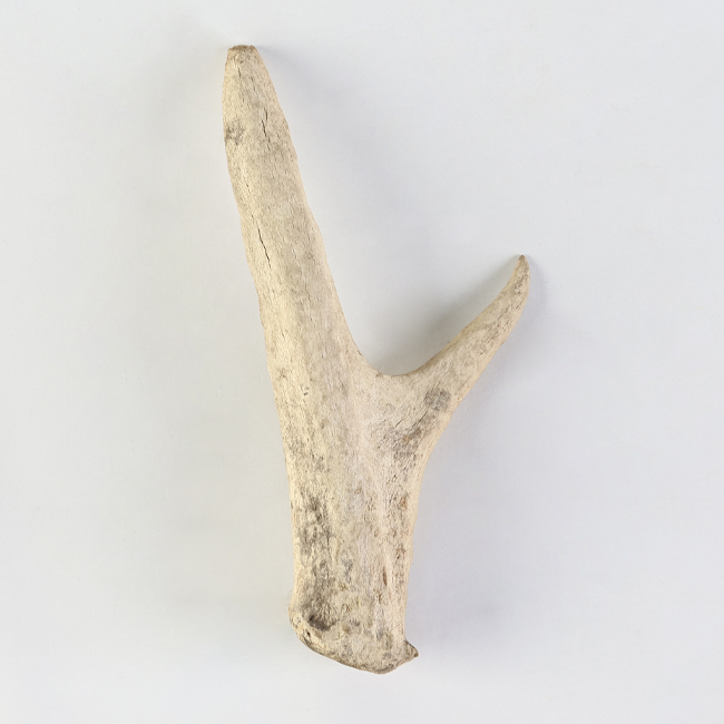 Fragmento de madera correspondiente a un nudo de árbol, de forma irregular y alargada, con una bifurcación lateral que le otorga un aspecto ramificado. Presenta superficies desgastadas, textura rugosa y vetas visibles propias del material leñoso. El extremo inferior es más ancho y macizo, mientras que los extremos superiores son más estrechos y apuntados.
