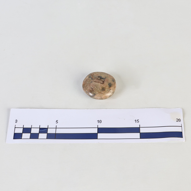 Objeto lítico de forma circular y perfil aplanado, con superficies superior e inferior relativamente planas y bordes suavemente redondeados. Presenta un espesor uniforme y un contorno regular.