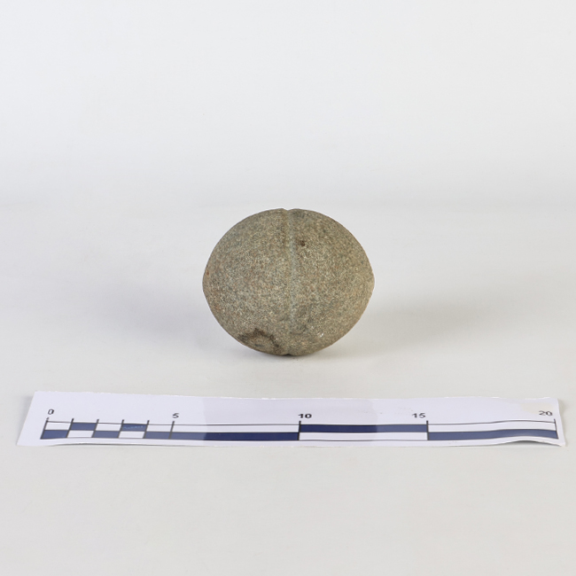 Objeto lítico, de forma esférica con una ranura por todo el contorno. De color gris. Esta formaba parte de una boleadora, atándose los tientos o cuerdas en la ranura.