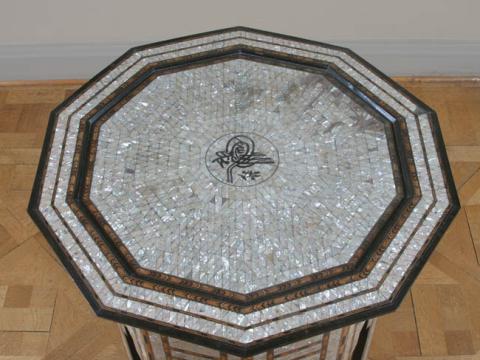 Mueble de apoyo de forma octogonal, con superficie superior plana y estructura vertical compuesta por ocho paneles alargados. Cada panel presenta decoración geométrica enmarcada por líneas rectas y franjas en tonos dorados, marrones y nácar al centro.