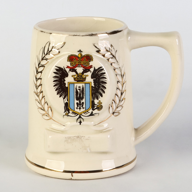 Objeto utilitario, contenedor para líquidos, hecho en cerámica, de cuerpo cilíndrico, su base es plana y de su pared exterior nace un asa gruesa para usar como tomador. En su exterior tiene un escudo con diseños de aves y coronas, el escudo es rodeado por una corona de laurel. En el contorno superior e inferior externos tiene una línea dorada decorativa.