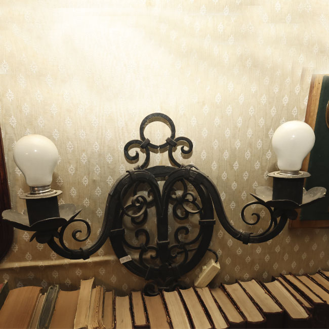Objeto de uso utilitario, lampara fijada a la pared, metálica. Presenta elemento central de forma ovalada y contorno grueso, con decoración ornamental en relieve. Desde este cuerpo central se proyectan dos brazos curvos simétricos que se extienden hacia los costados, cada uno con soporte para ampolleta en el extremo. En la base de cada soporte se observan elementos decorativos con forma de pétalos.