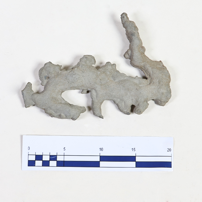 Fragmento irregular de material pétreo o calcáreo, color gris claro. Presenta superficie porosa y bordes sinuosos con múltiples salientes y cavidades. De contorno alargado e irregular.