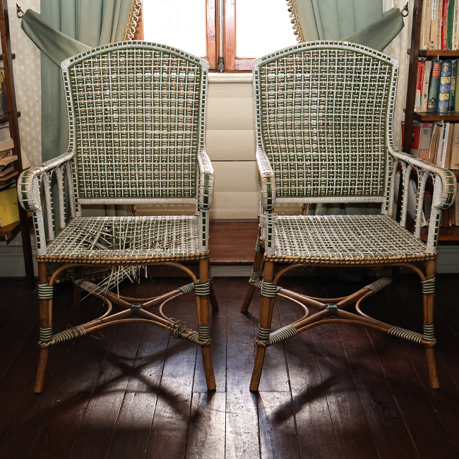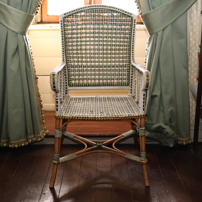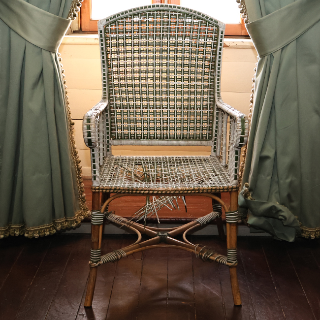 Objeto mobiliario, silla de madera con respaldo y asiento de entramado. Presenta apoyabrazos laterales y estructura de cuatro patas unidas por travesaños.