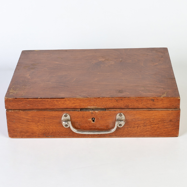 Maletín de madera de forma rectangular con tapa abatible. En su interior contiene diversos elementos de aseo personal dispuestos en compartimientos. El conjunto presenta estructura rígida y acabado liso en su exterior.