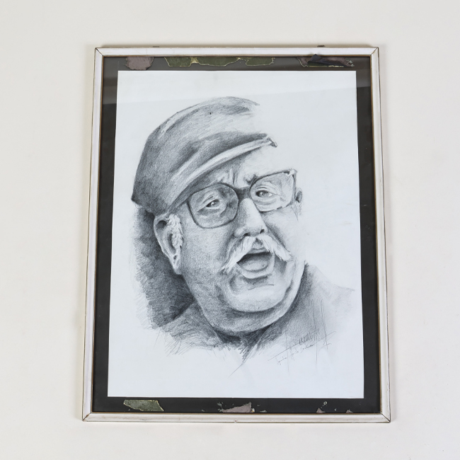 Retrato en blanco y negro de busto masculino con gorra y gafas. Presenta bigote y boca abierta. Realizado con sombreado y trazos. Hoja blanca sobre fondo oscuro, enmarcado.
