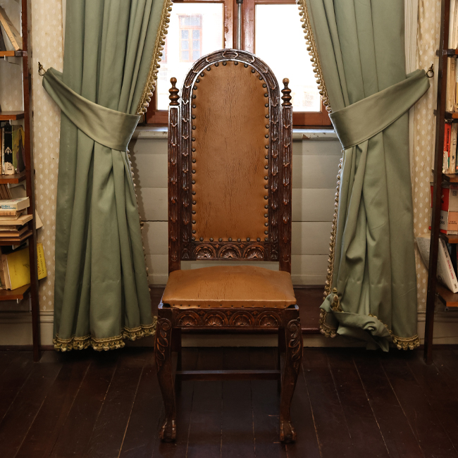 Mobiliario de asiento unipersonal. Silla con respaldo alto en forma de arco, de centro liso y acolchado con contorno ornamentado. Su asiento posee un cojín acolchado, tiene cuatro patas de apoyo, también ornamentadas.