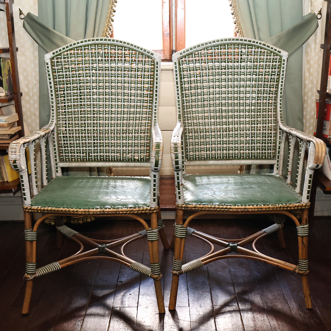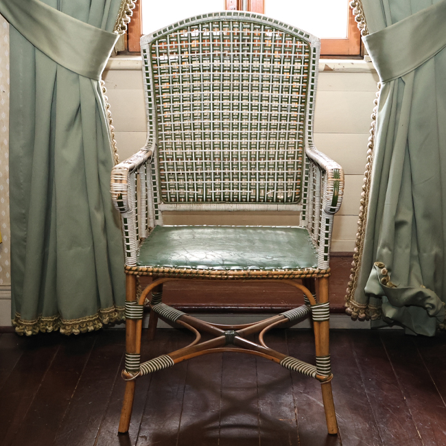Mobiliario de asiento unipersonal, silla de madera con respaldo y asiento de entramado. Presenta apoyabrazos laterales y estructura de cuatro patas unidas por travesaños.