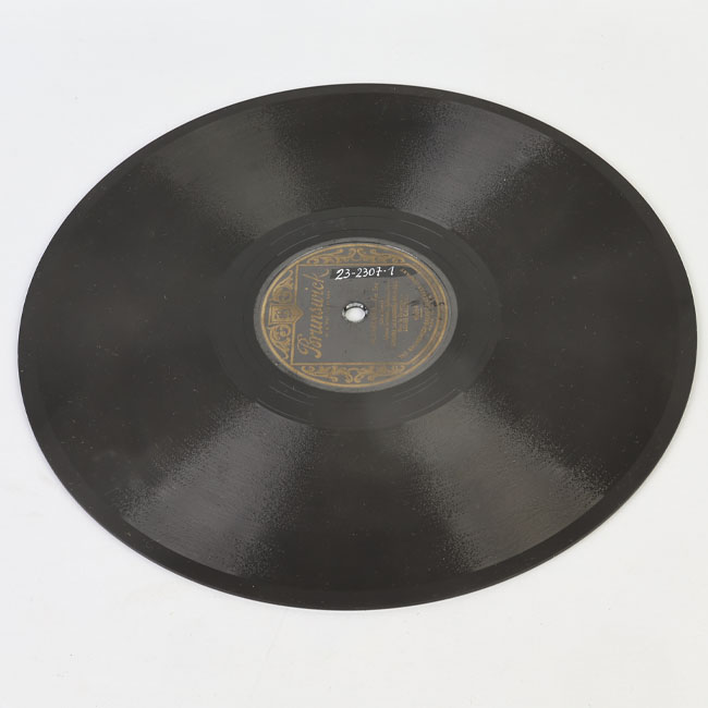 Objeto de difusión musical. Disco de vinilo de color negro con surcos en circunferencia. En su parte central tiene una etiqueta circular con tipografía impresa de color negro y dorado.