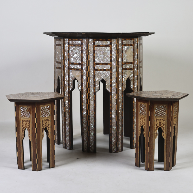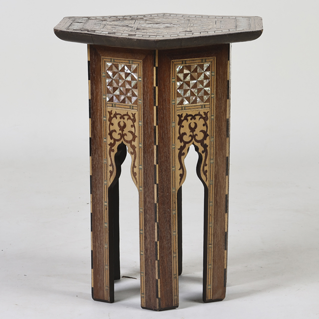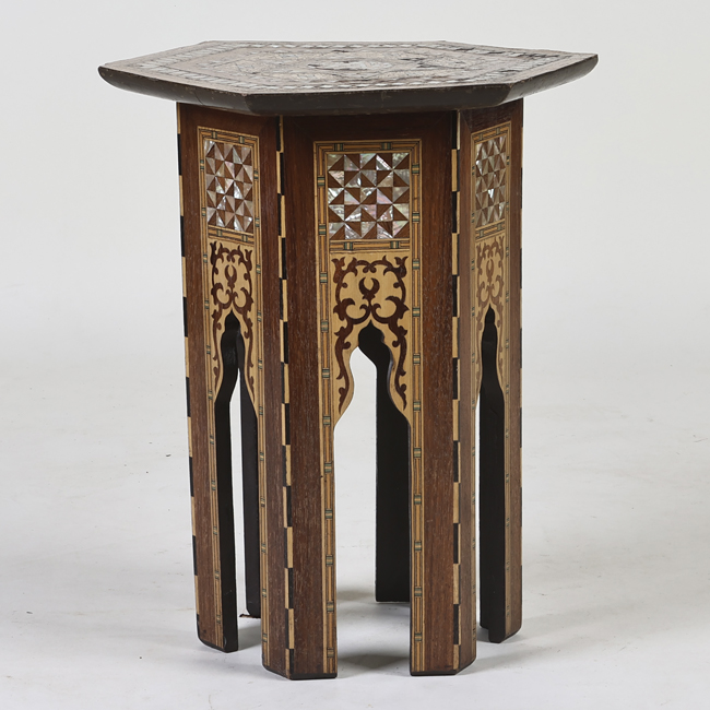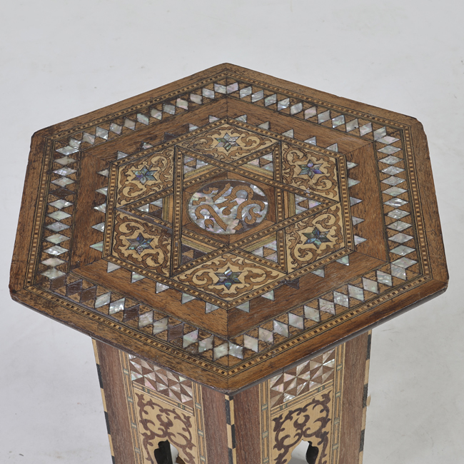 Mueble de apoyo, compuesto por una cubierta hexagonal, delantal y seis patas rectas. Decoración taraceada con madera y nácar, al centro de la cubierta una figura de una estrella.