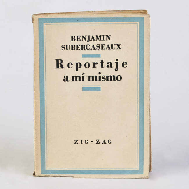 Libro de formato rectangular, compuesto por un conjunto de hojas con textos regulares, encuadernadas mediante un lomo. Presenta cubiertas rígidas, donde se lee el título: “Reportaje a mí mismo".