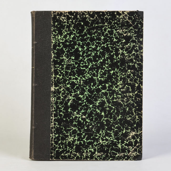 Libro de formato rectangular, compuesto por un conjunto de hojas con textos regulares, encuadernadas mediante un lomo. Presenta cubiertas rígidas con patrones de líneas irregulares.