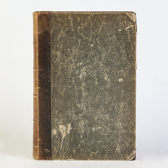 Libro de formato rectangular, compuesto por un conjunto de hojas con textos regulares, encuadernadas mediante un lomo. Presenta cubiertas rígidas con patrones irregulares de líneas.