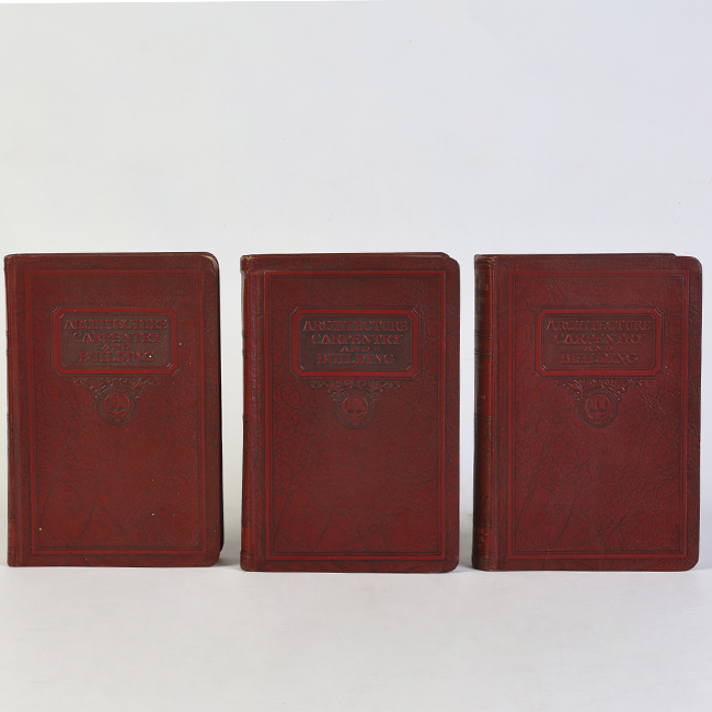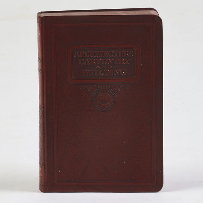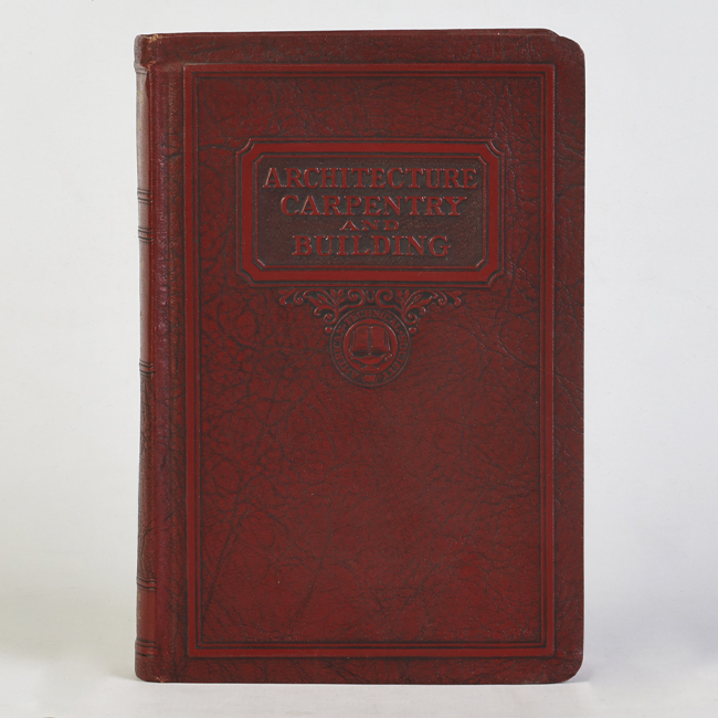 Libro de formato rectangular, compuesto por un conjunto de hojas con textos regulares, encuadernadas mediante un lomo. Presenta cubiertas rígidas, donde se lee el título: “Architecture carpentry and building".