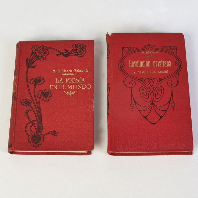 Libros de formato rectangular, compuestos por un conjunto de hojas con textos regulares, encuadernadas mediante un lomo. Presentan cubiertas rígidas, de color rojo.