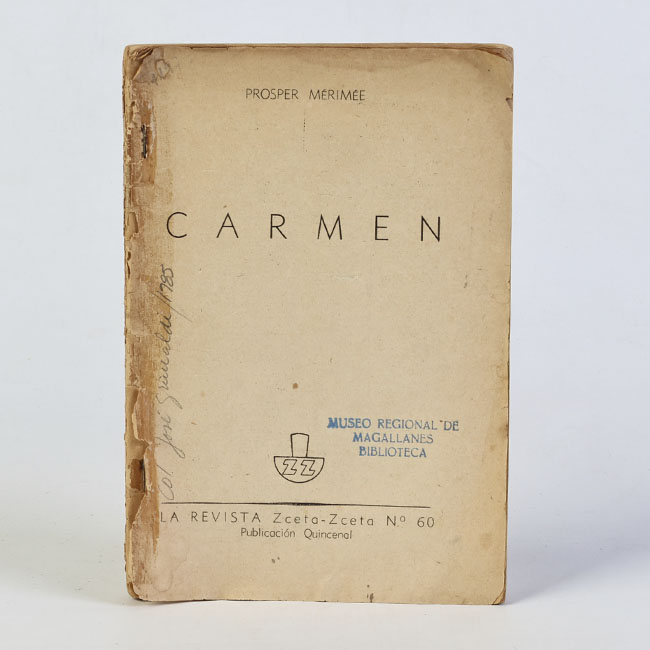 Libro de formato rectangular, compuesto por un conjunto de hojas con textos regulares, encuadernadas mediante un lomo. Presenta cubiertas rígidas, donde se lee el título: “ Carmen ".