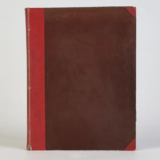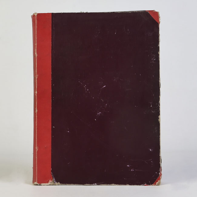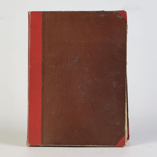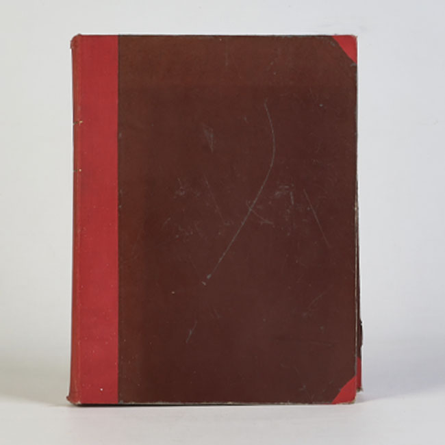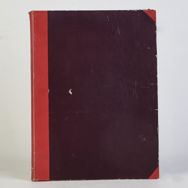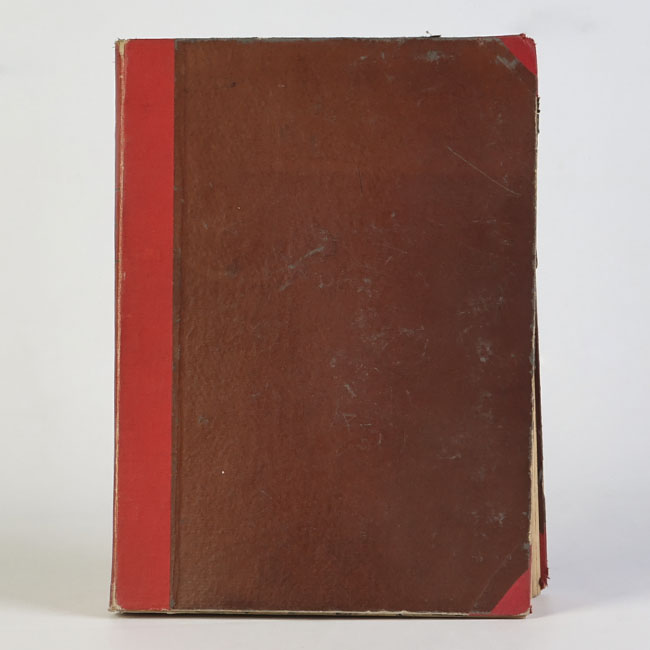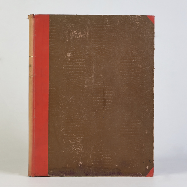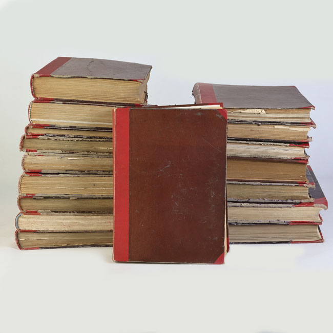 Conjunto de libros de formato rectangular, con encuadernación en tapa dura, cubiertas de color marrón y lomos en rojo, compuestos por un conjunto de hojas unidas por un lomo.