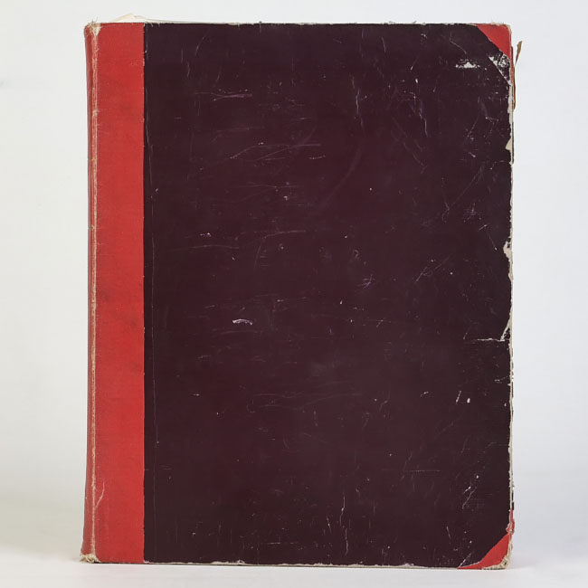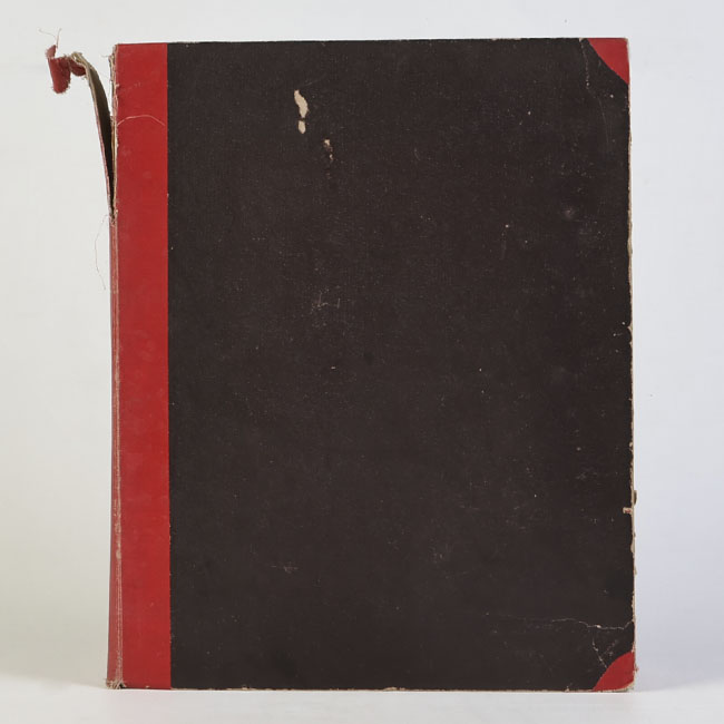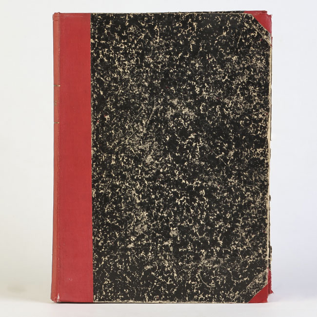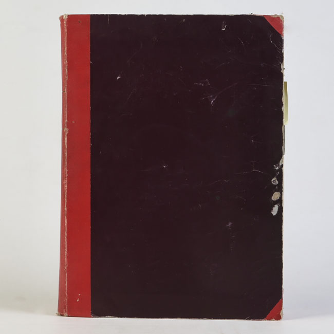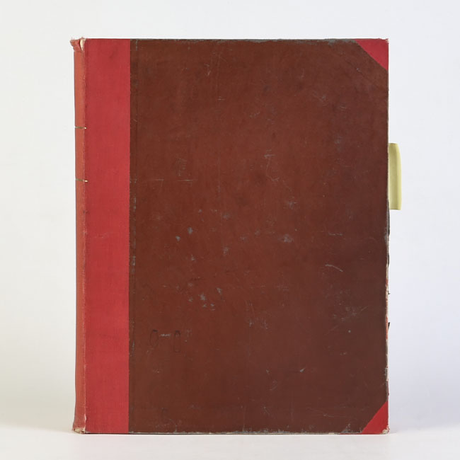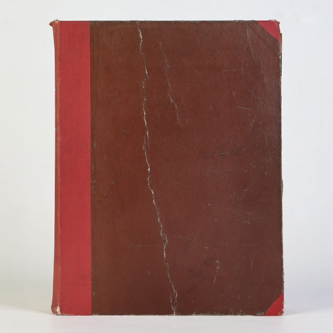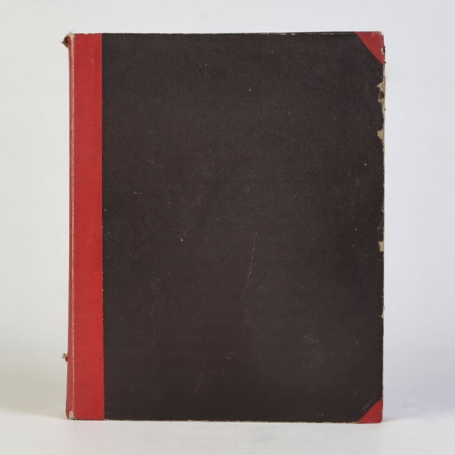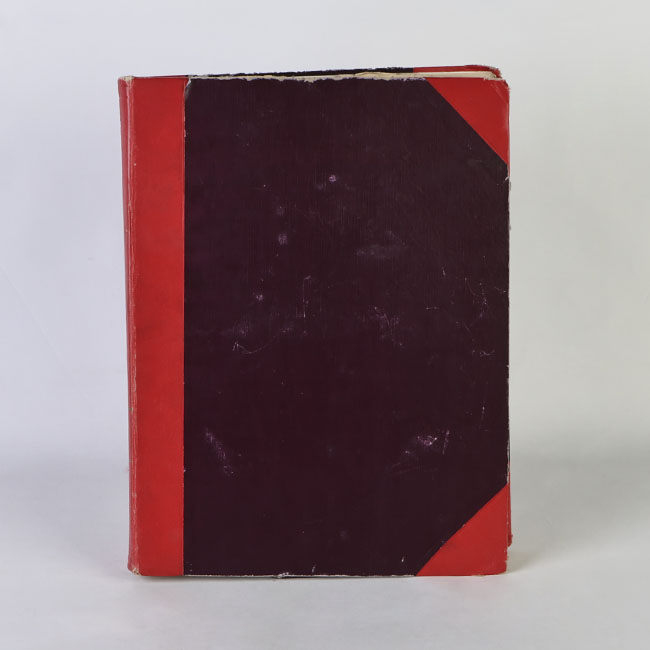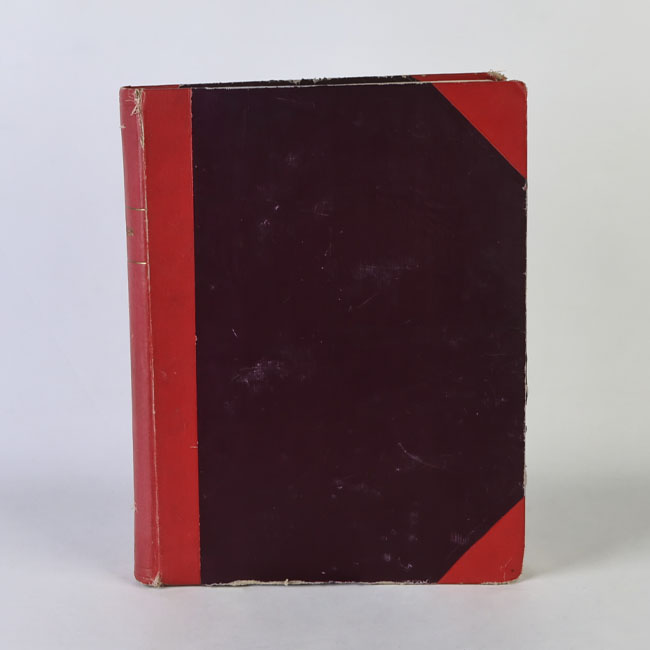 Conjunto de libros de formato rectangular, con encuadernación en tapa dura, cubiertas de color marrón y lomos en rojo, compuestos por un conjunto de hojas unidas por un lomo.