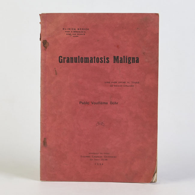 Libro de formato rectangular, compuesto por un conjunto de hojas con textos regulares, encuadernadas mediante un lomo. Presenta cubiertas rígidas, donde se lee el título: “ Granulomatosis maligna".