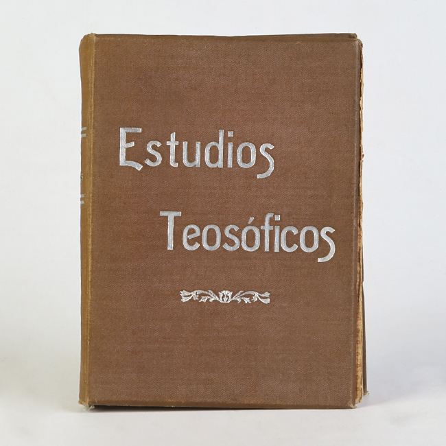 Libro de formato rectangular, compuesto por un conjunto de hojas con textos regulares, encuadernadas mediante un lomo. Presenta cubiertas rígidas, donde se lee el título: “Estudios teosóficos".
