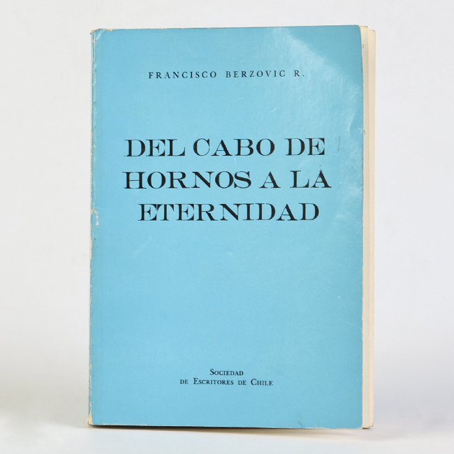 Libro de formato rectangular, compuesto por un conjunto de hojas con textos regulares, encuadernadas mediante un lomo. Presenta cubiertas rígidas, donde se lee el título: “Del Cabo de Hornos a la eternidad".
