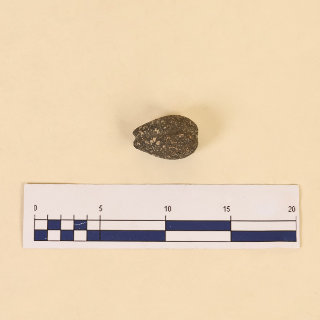 Objeto lítico de contorno irregular, con un extremo más ancho y otro más estrecho, levemente aplanado. Superficie con moteado en tonos azules y grises, de distribución no uniforme. Textura compacta.