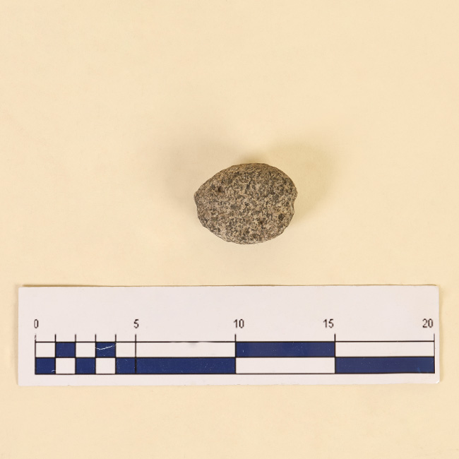 Objeto lítico de forma subesférica levemente aplanada. Superficie irregular con moteado en tonos azules y grises, de distribución no uniforme. Textura compacta.