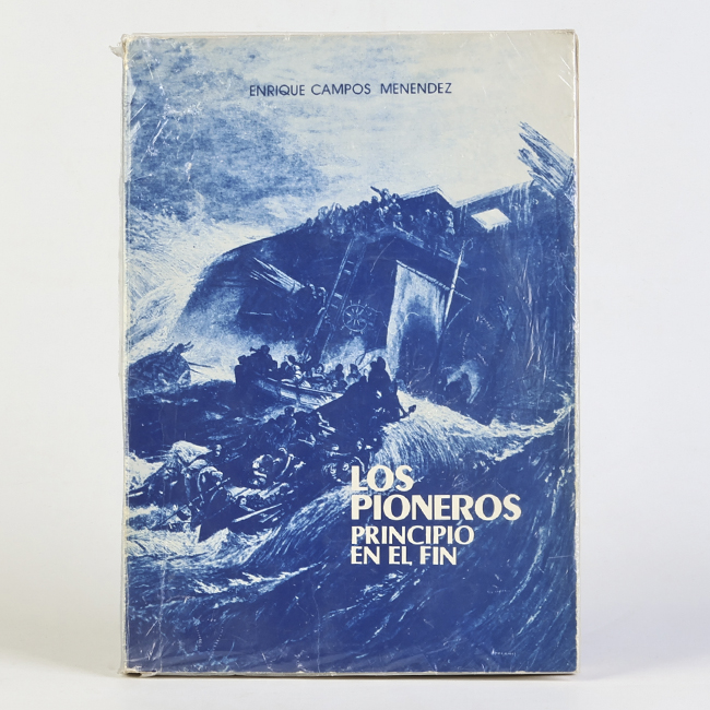 Libro de formato rectangular, compuesto por un conjunto de hojas con textos regulares, encuadernadas mediante un lomo. Presenta cubiertas rígidas, donde se lee el título: “Los pioneros principio en el fin".