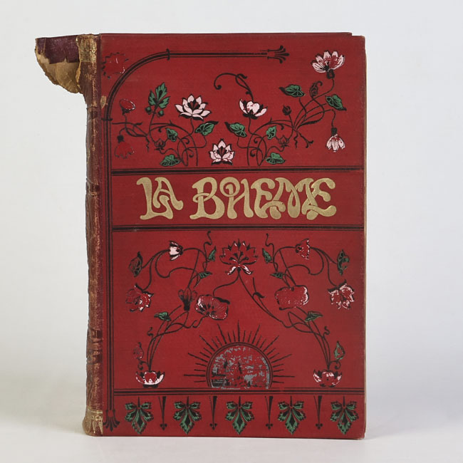 Libro de formato rectangular, compuesto por un conjunto de hojas con textos regulares, encuadernadas mediante un lomo. Presenta cubiertas en color rojo, donde se lee el título: “ La bohéme".