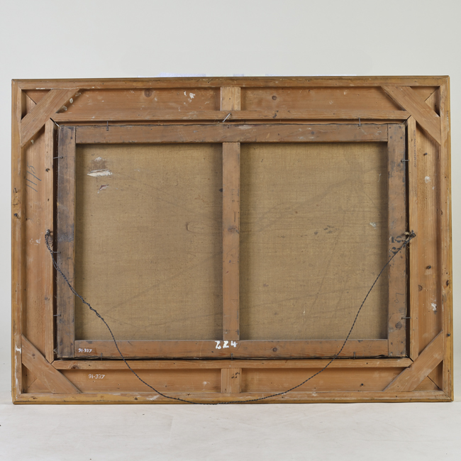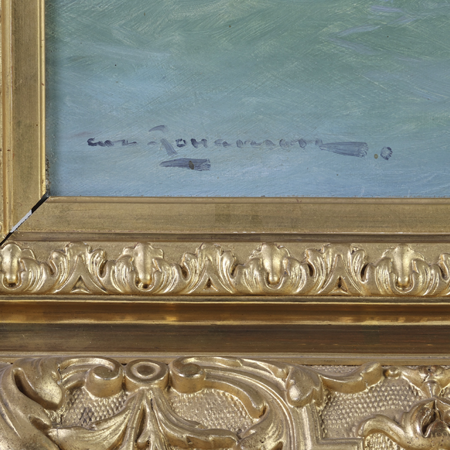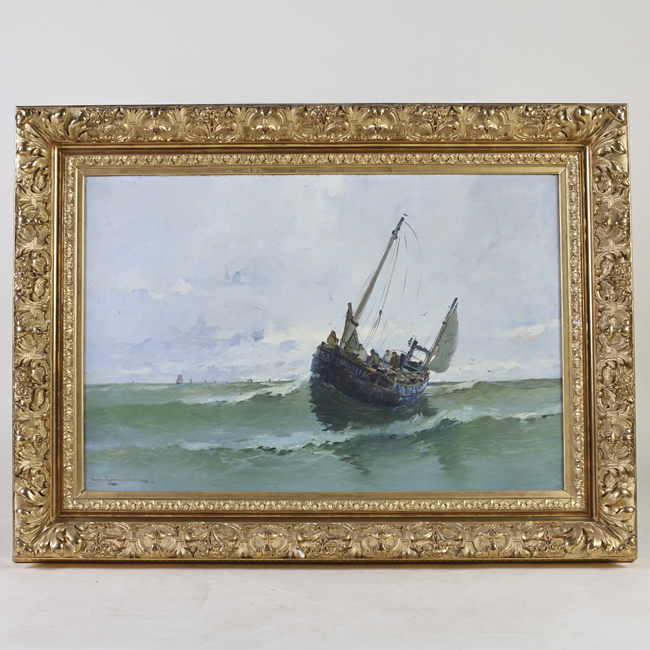 Obra de formato rectangular. Paisaje marino, a la derecha una embarcación de madera a vela con tripulantes a bordo. En el horizonte se divisan algunas velas de otras embarcaciones. Fondo cielo y nubes. Marco dorado.