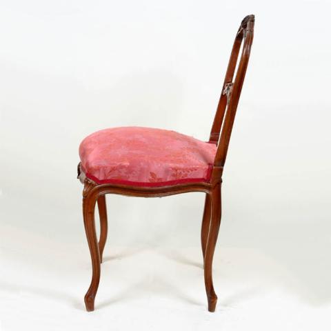 Mueble unipersonal, compuesto por asiento tapizado en tela de color rojo y respaldo abierto, lleva un travesaño curvo con decoraciones florales y cuatro patas cabriolé. Es parte de un amoblado, son cinco sillas iguales.