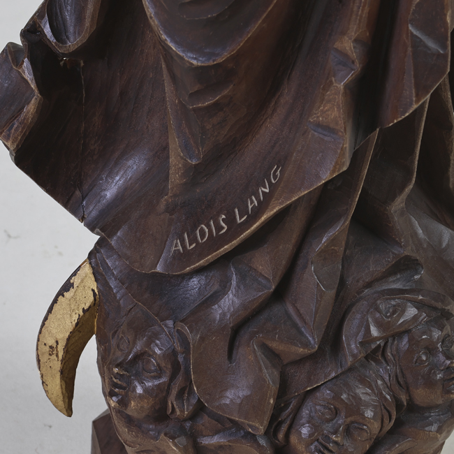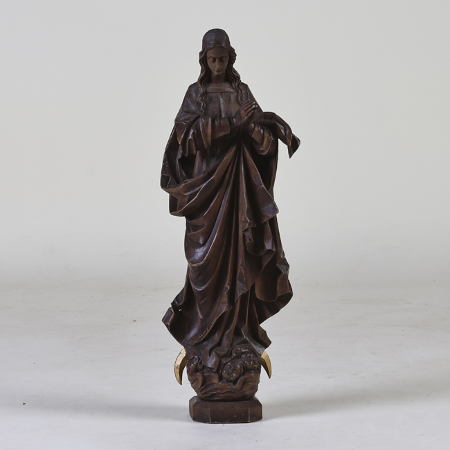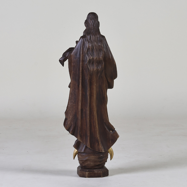 Obra exenta. Figura femenina de pie y de frente de color marrón, tiene cabeza levemente inclinada hacia abajo, ambas manos juntas a la altura del pecho, está posada sobre esfera con cabeza de figuras infantiles que en cada extremo tiene dos puntas amarillas. Viste vestido largo con pliegues y capa sosteniendo una punta con el antebrazo izquierdo.